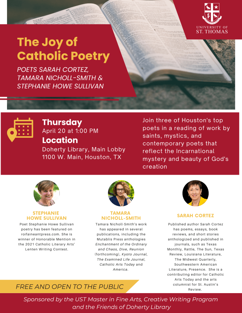 Celebrate poetry month! Join me, along with Catholic Literary Arts poets Sarah Cortez and Stephanie Howe Sullivan, for The Joy of Catholic Poetry at the University of Saint Thomas Doherty Library this April. We will be reading a selection of poems from well-known and not-so-well-known authors past and present as well as a poem or two of our own.